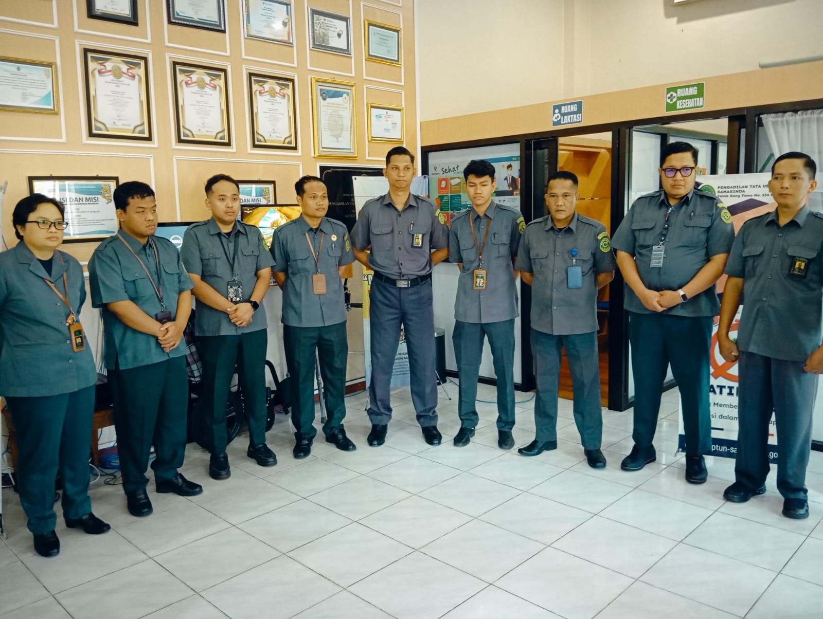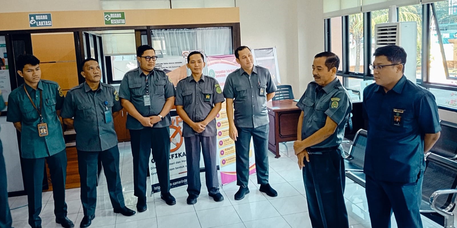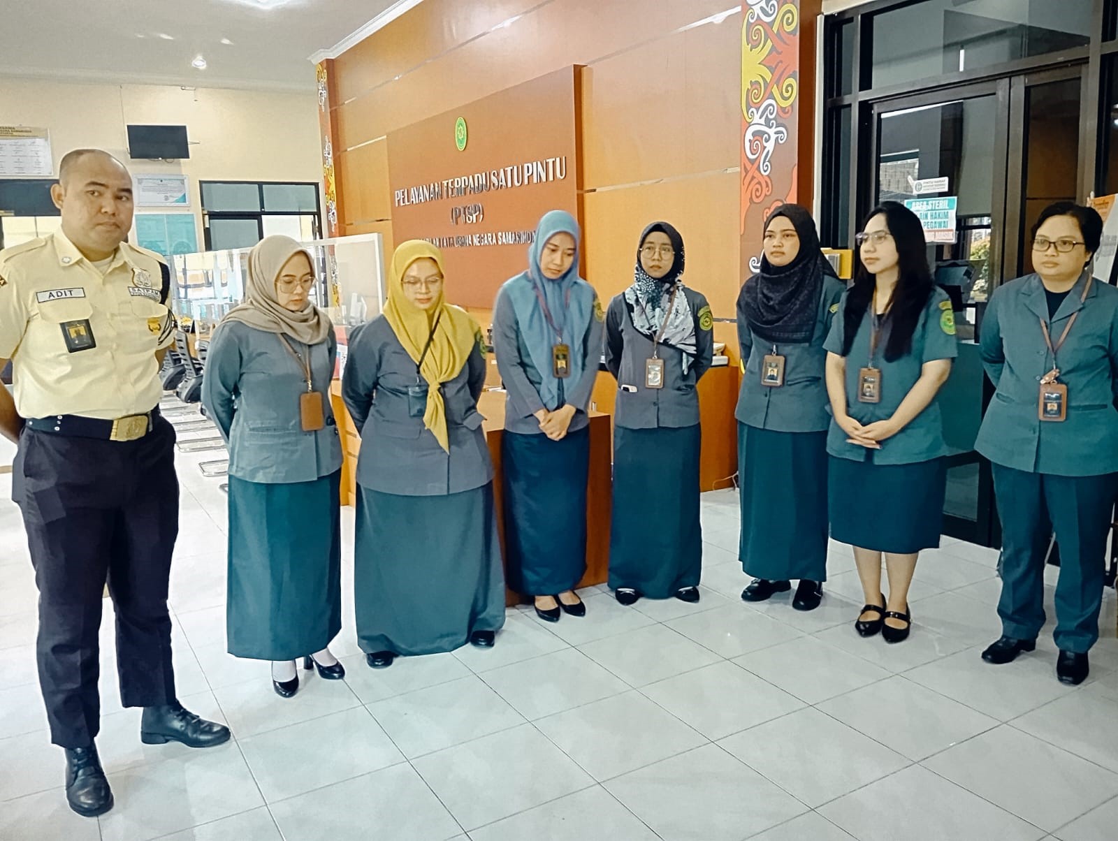 Samarinda, 7 Oktober 2025. Briefing PTSP oleh Panitera Muda Perkara dan Ka. Sub Bag. Perencanaan, TI dan Pelaporan kepada Petugas PTSP dan Petugas Piket PTSP di Lobby Ruang Tunggu Kantor PTUN Samarinda.